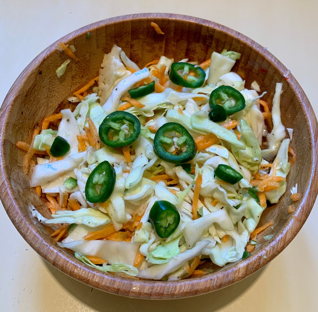 - Combine shredded cabbage and carrot along with diced jalapeño in serving bowl.